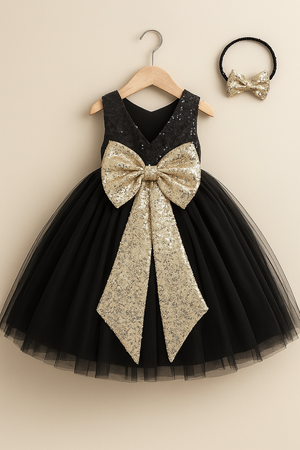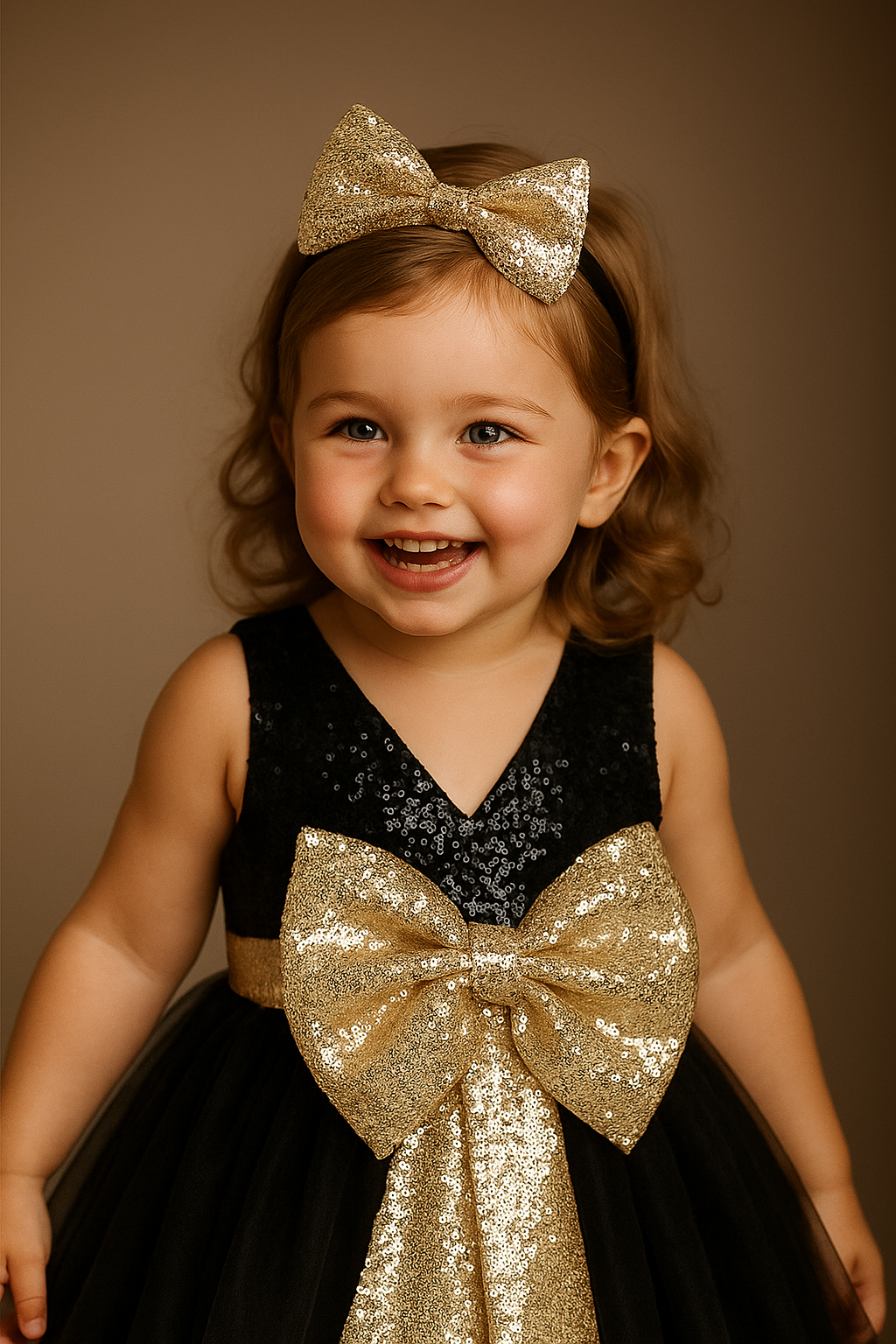- Accessories: Comes with a matching golden bow headband to complete the look.